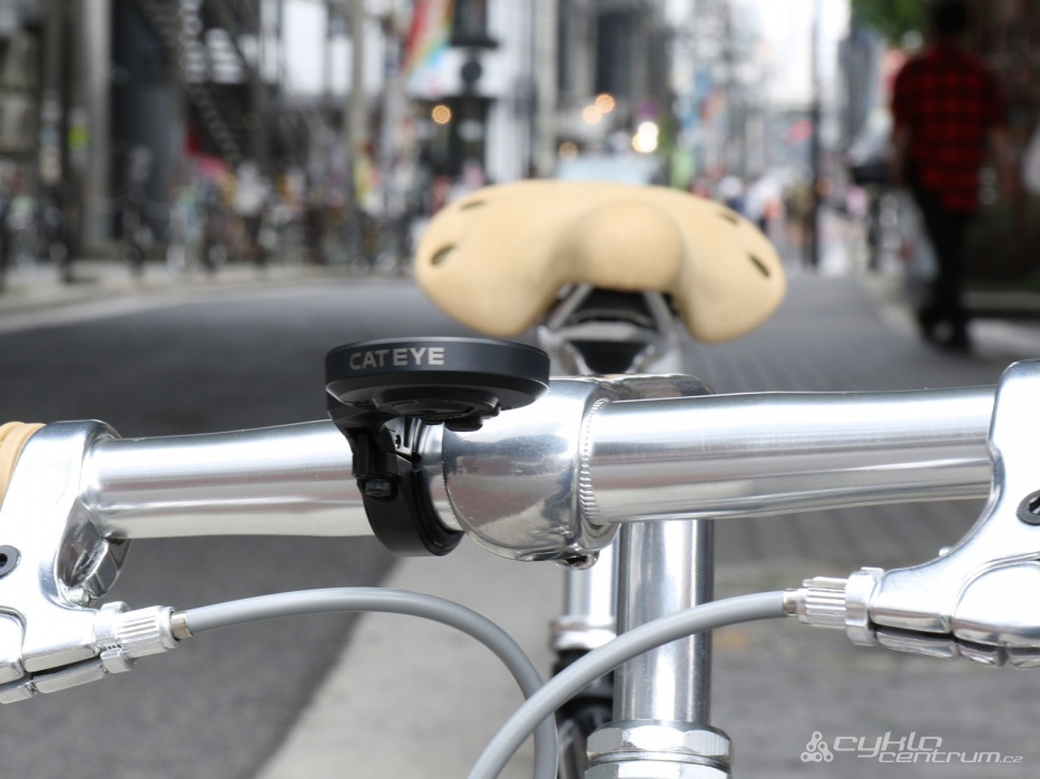 Bezdrátový cyklopočítač CATEYE s inverzním displejem (displej černý, číslice světlé). 7 funkcí: denní / celková vzdálenost, okamžitá / průměrná / ...