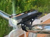 Přední dobíjecí světlo CATEYE AMPP200 s technologií OptiCube (speciální konstrukce optických čoček usměrňující tok světla pro lepší osvícení vozovky). Indikátor kapacity akumulátoru a dobíjení integrovaný do vypínače.
